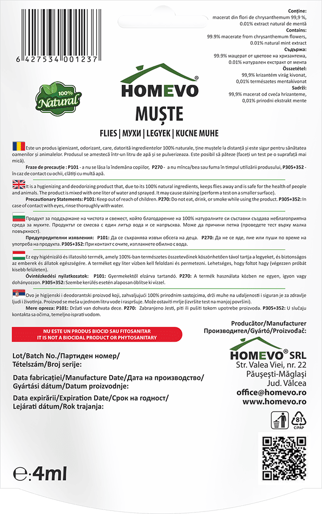 HOMEVO MUȘTE este un produs igienizant și odorizant natural, formulat pentru îndepărtarea muștelor din spațiile interioare sau exterioare. Conține macerat din flori de Chrysanthemum și extract natural de mentă, ingrediente recunoscute pentru efectul lor repelent. Produsul se amestecă cu maximum 2 litri de apă și se aplică prin pulverizare în zonele frecventate de muște, cum ar fi bucătării, terase, ferestre sau curți. Se recomandă testarea în prealabil pe o zonă ascunsă, deoarece poate păta unele suprafețe sau pereți.