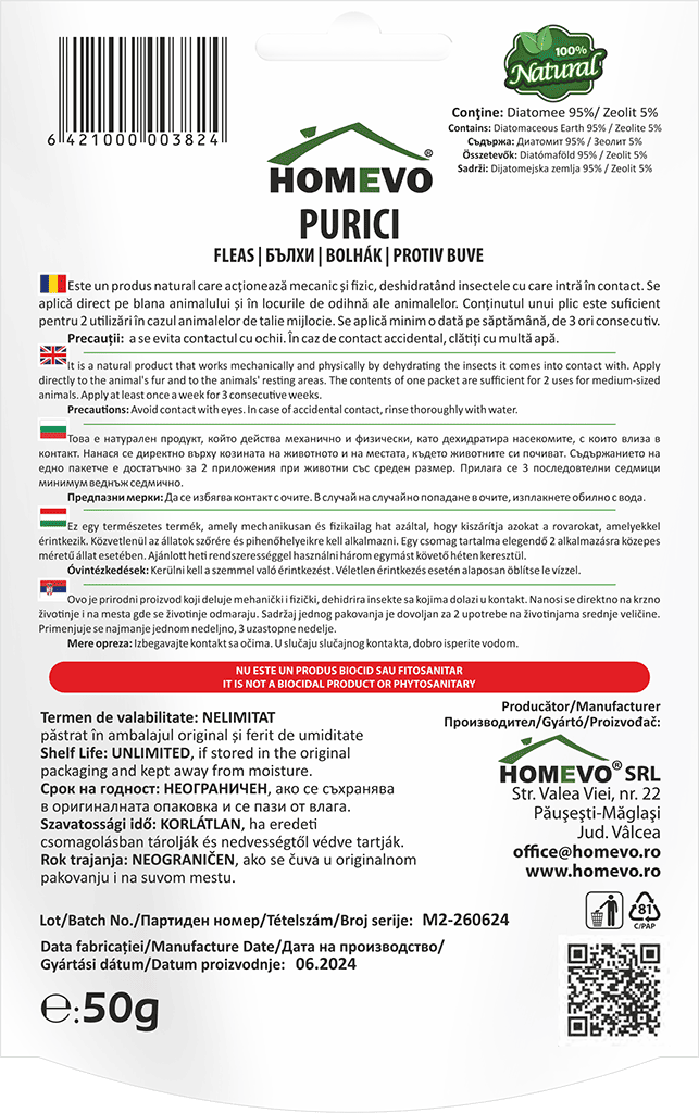 HOMEVO PURICI este un produs natural sub formă de pulbere, utilizat pentru combaterea puricilor din spațiile de locuit ale animalelor de companie (câini, pisici) sau din adăposturi, cuști, covoare și podele. Produsul se aplică direct pe suprafețele infestate sau în zonele de staționare ale animalelor. Se poate aplica și pe blana animalelor, evitând contactul cu ochii, nasul și gura, cu condiția ca pulberea să fie bine distribuită și periată în blană. Reaplicați după 7–10 zile, în funcție de gradul de infestare.